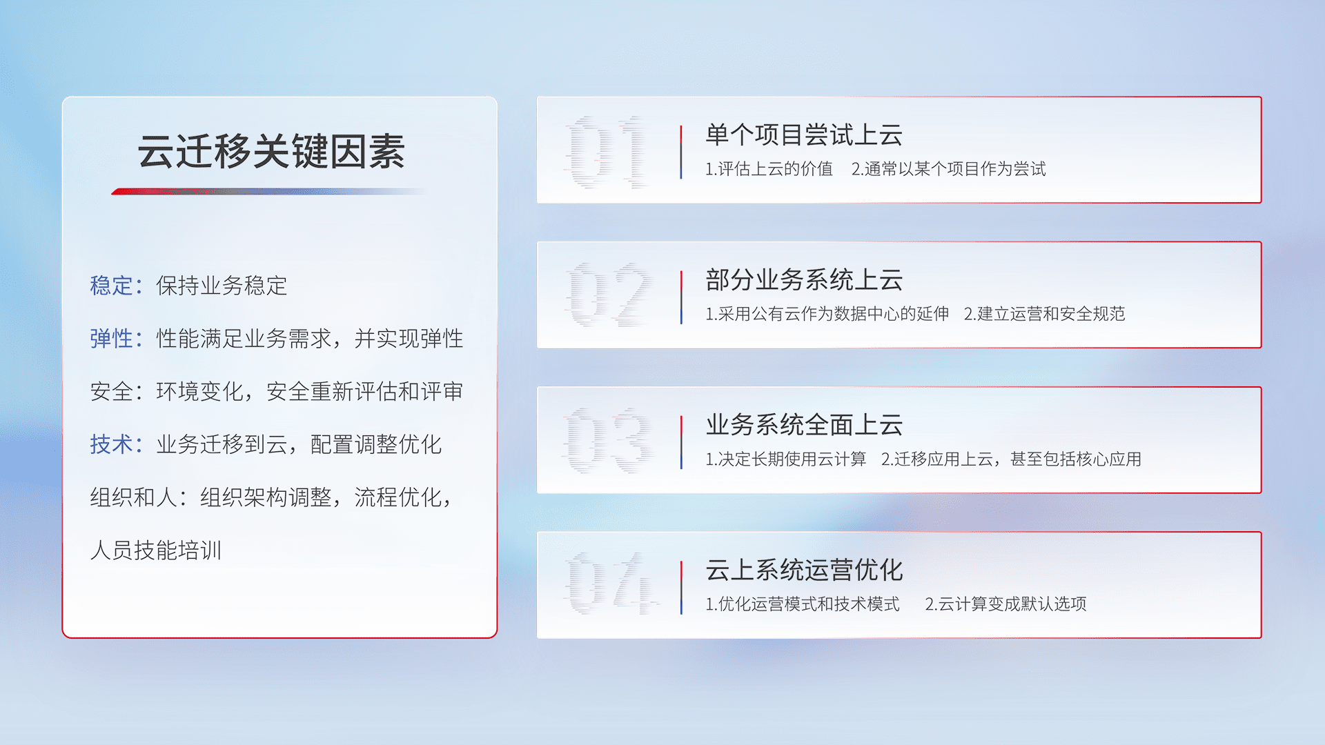 结合实际业务,,从规划设计、、云平台选型、、、、云原生改造、、、数据迁移、、集成交付,,,,迁移全过程为客户识别最佳上云路径,,做好风险识别管理,,设计网络架构、、、、身份权限、、、安全审计合规、、操作审计、、、日志审计、、监控告警策略、、、多站点容灾设计等,,,,对云上基础设施进行整体规划,,,,提升IT治理水平,,以满足弹性、、高可用、、、高性能的需求。。。