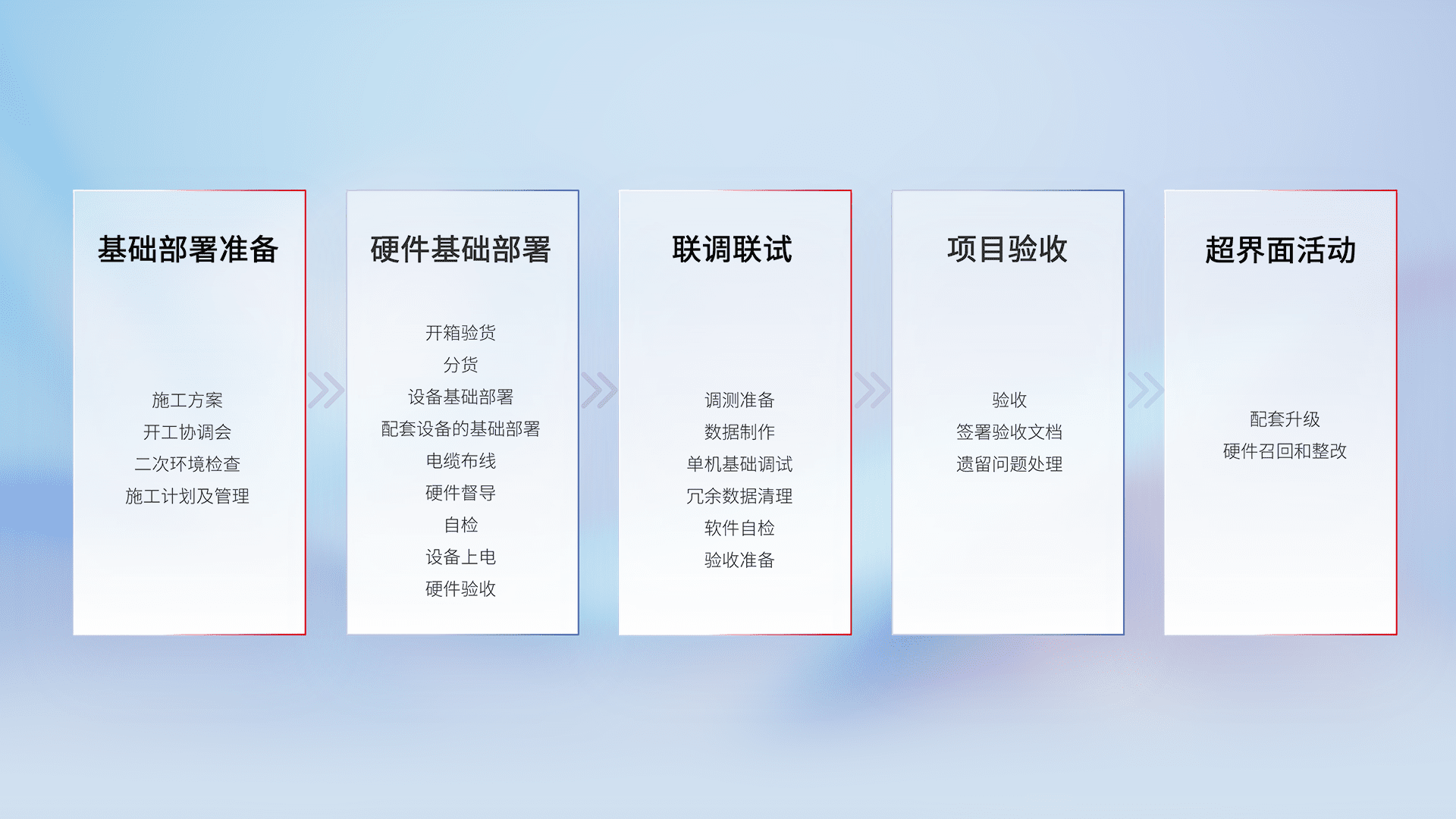从基础部署准备、、、、硬件基础部署、、、联调联试、、、、项目验收、、、越界面活动的全过程可追溯,,,保证施工质量和进度。。。